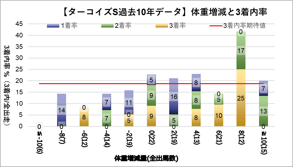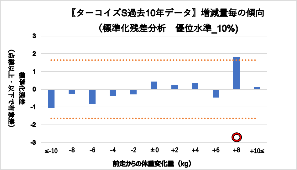 増減量+8kg(複勝率41.7%)に統計的有意差が認められ、平均複勝率(19%)よりも好走する傾向が見られた。
