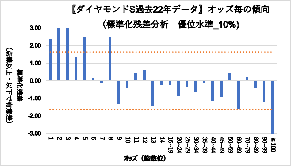 1.0~1.9倍(複勝率100%)、2.0~2.9倍(複勝率70.0%)、3.0~3.9倍(複勝率62.5%)、5.0~5.9倍(複勝率62.5%)、8.0~8.9倍(複勝率62.5%)これらのオッズ帯に統計的有意差が認められ、平均複勝率(21%)よりも好走する傾向が見られた。