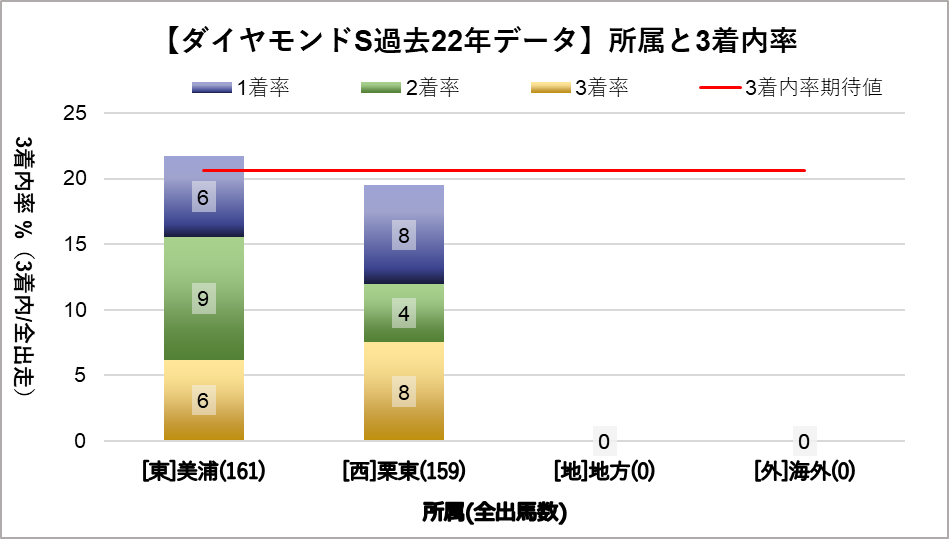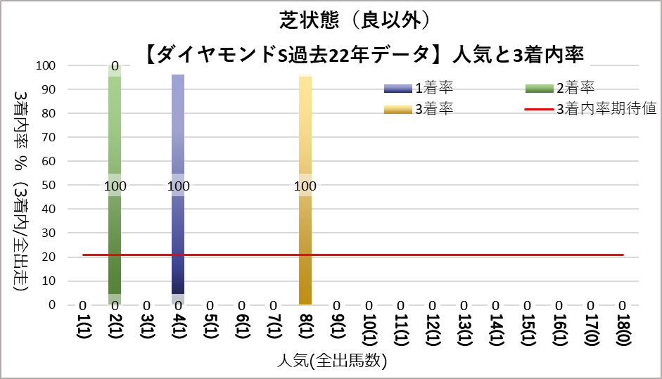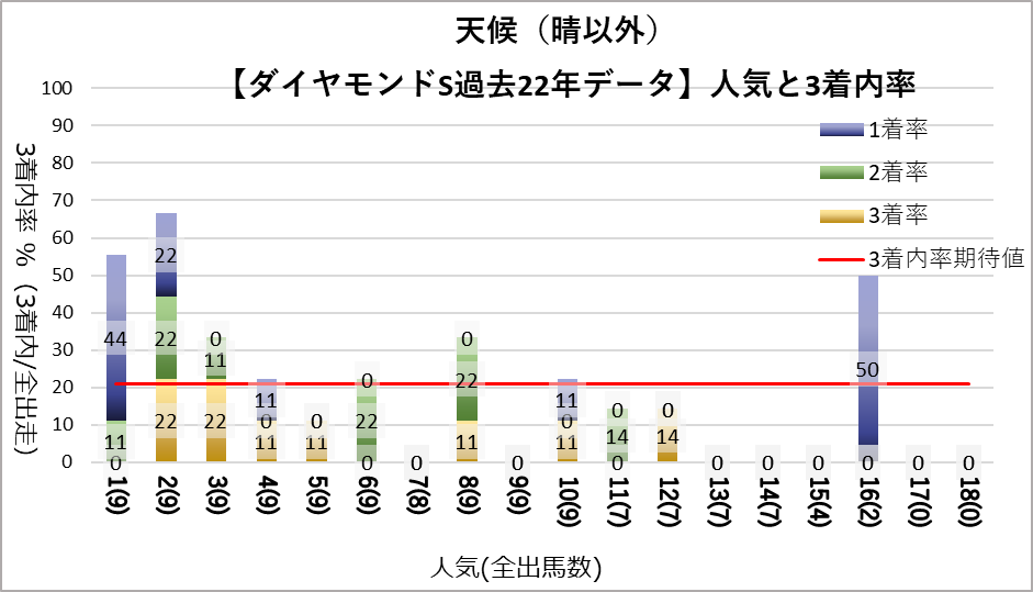 1人気(複勝率63.6%)、2人気(複勝率59.1%)に統計的有意差が認められ、平均複勝率(21%)よりも好走する傾向が見られた。