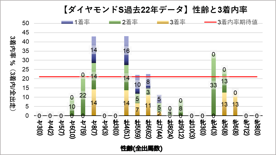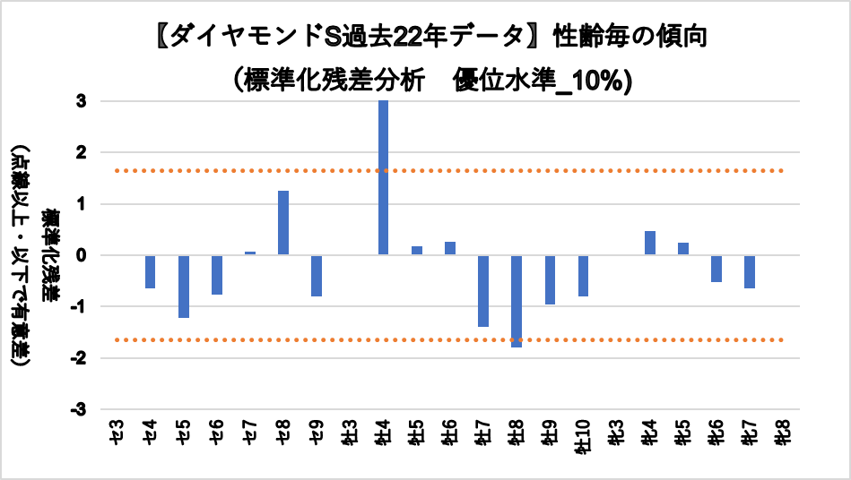牡馬4歳(複勝率43.1%)に統計的有意差が認められ、平均複勝率(21%)よりも好走する傾向が見られた。