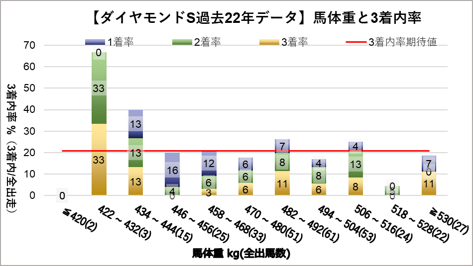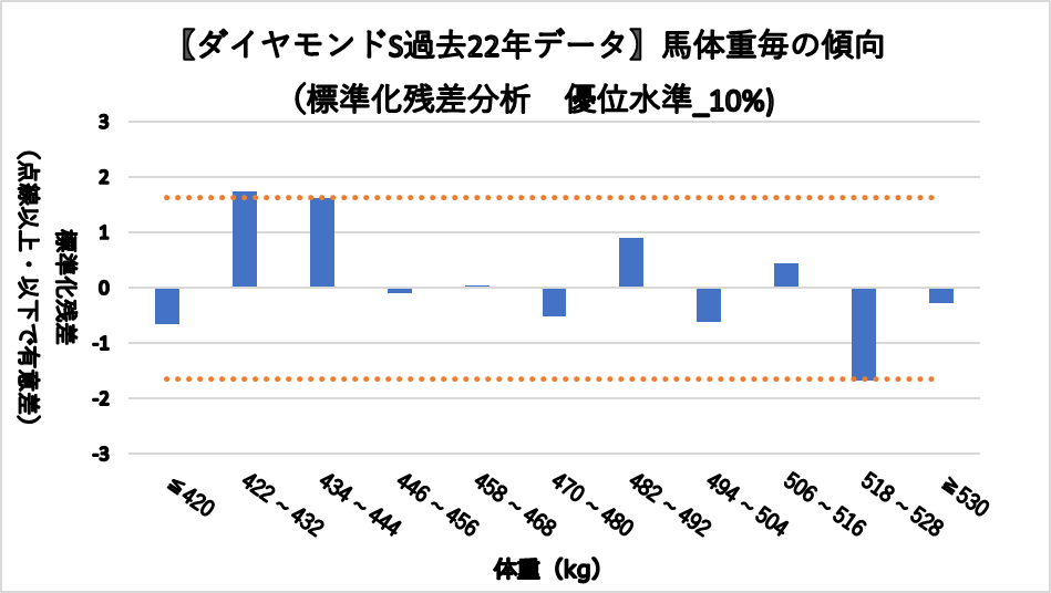 馬体重422~432kgレンジ(複勝率66.7%)において、統計的有意差が認められ、平均複勝率(21%)よりも好走する傾向が見られた