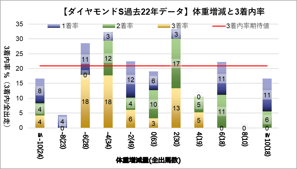 一方、馬体重518~528kgレンジ(複勝率4.5%)は有意に凡走する傾向が見られた。