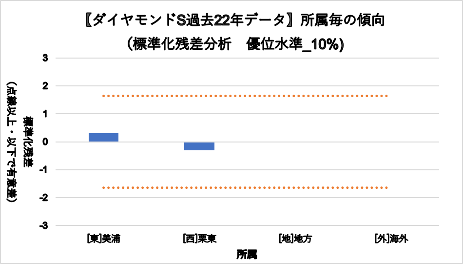統計的に有意差があった項目について、3着内率グラフと統計処理(標準残差分析)グラフの2つを掲載しています。