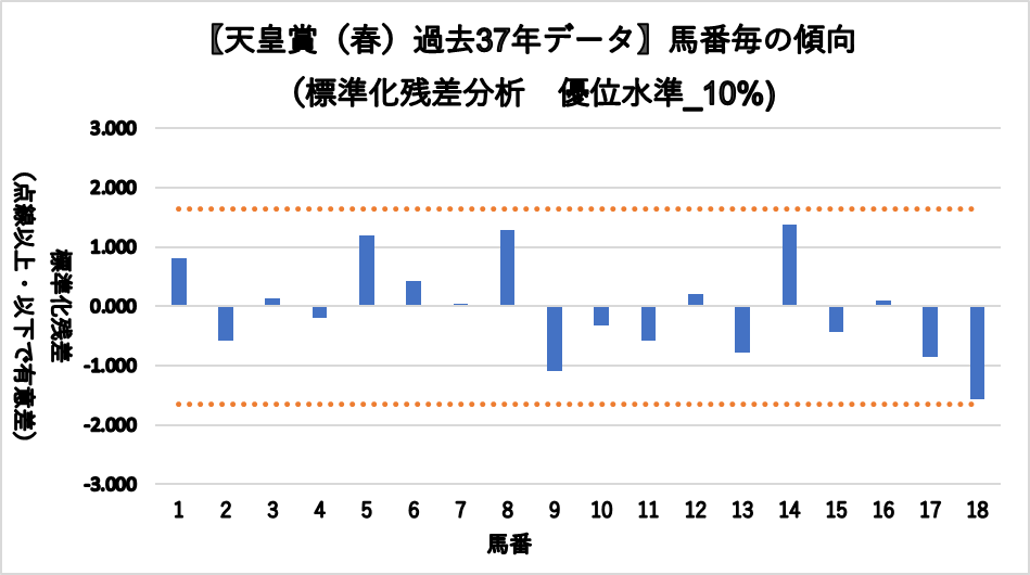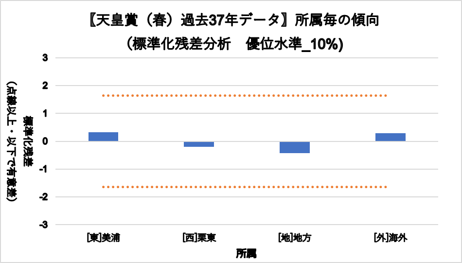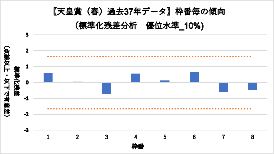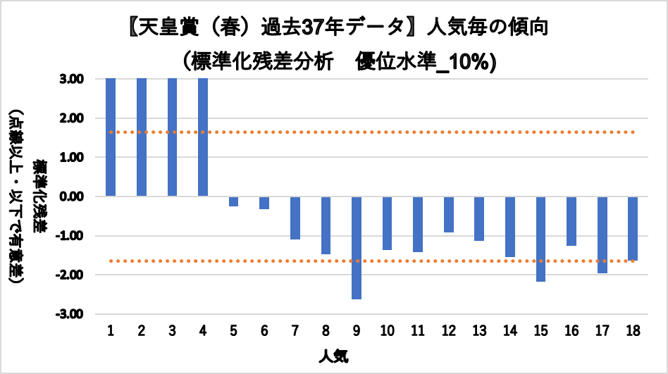 統計的に有意差があった項目について、3着内率グラフと統計処理(標準残差分析)グラフの2つを掲載しています。
