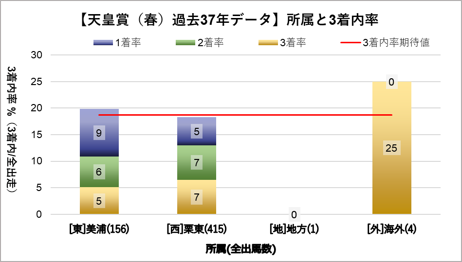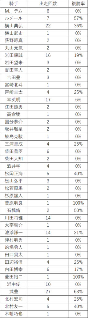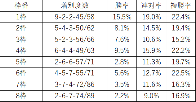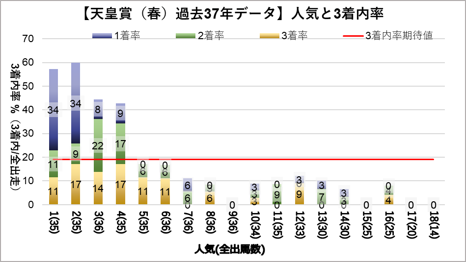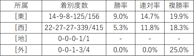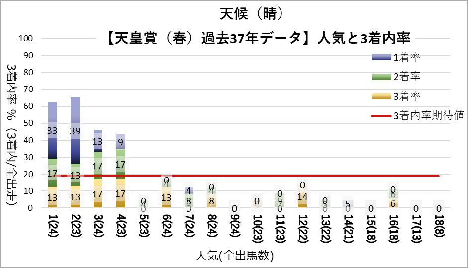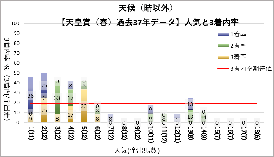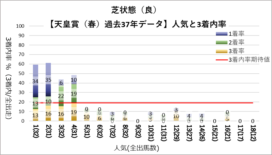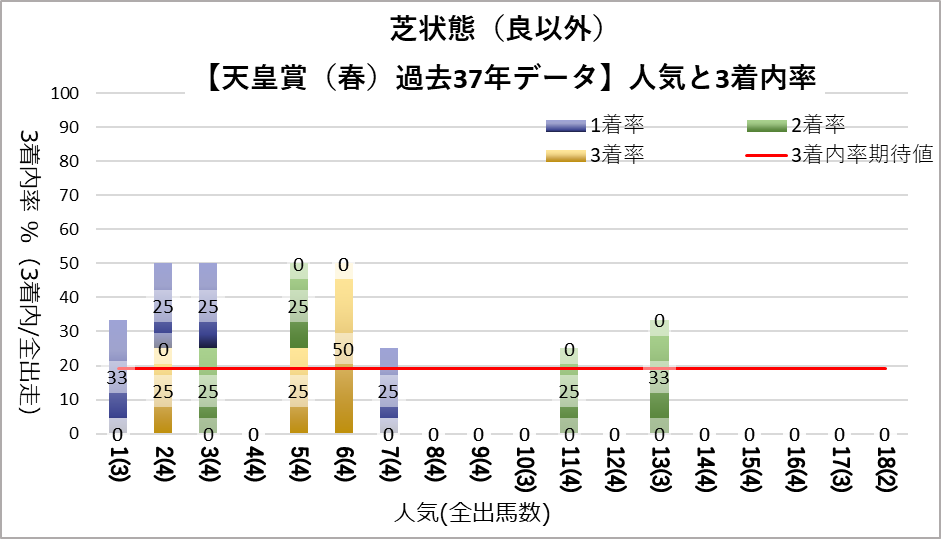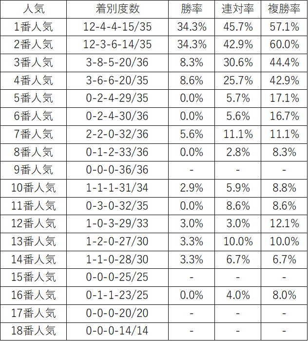 1人気(複勝率57.1%)、2人気(複勝率60.0%)、3人気(複勝率44.4%)、4人気(複勝率42.9%)これらの人気に統計的有意差が認められ、平均複勝率(19%)よりも好走する傾向が見られた。