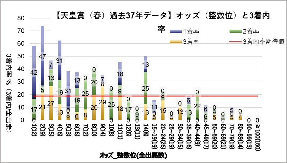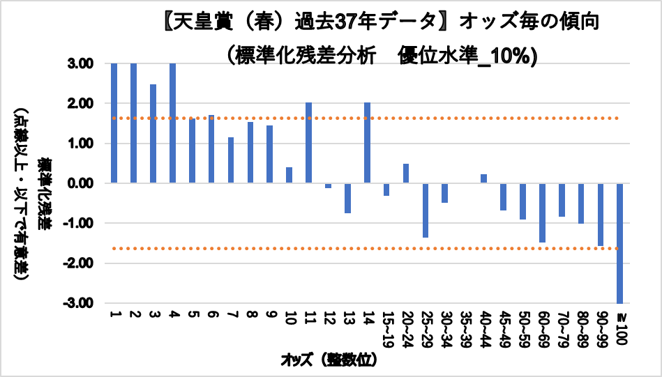 オッズ1.0~1.9倍(複勝率58.3%)、2.0~2.9倍(複勝率73.7%)、3.0~3.9倍(複勝率46.7%)、4.0~4.9倍(複勝率62.5%)、6.0~6.9倍(複勝率37.5%)、11.0~11.9倍(複勝率45.5%)、14.0~14.9倍(複勝率50.0%)これらのオッズ帯に統計的有意差が認められ、平均複勝率(19%)よりも好走する傾向が見られた。