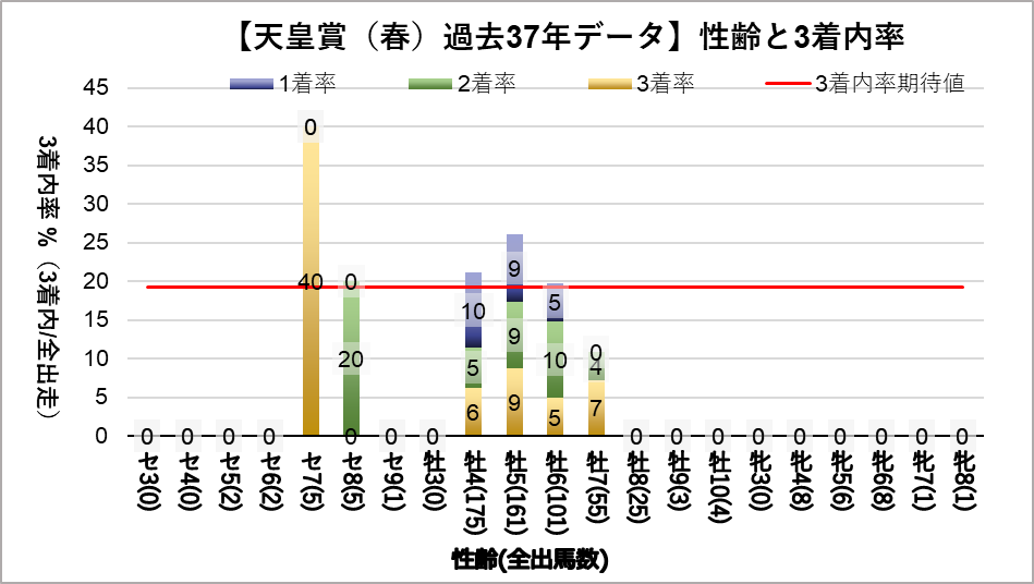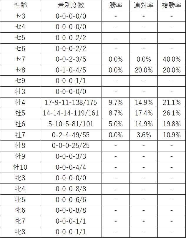 牡馬5歳(複勝率26.1%)に統計的有意差が認められ、平均複勝率(19%)よりも好走する傾向が見られた。