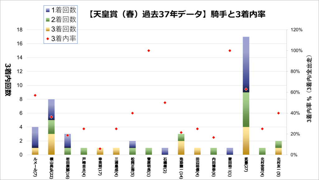 過去馬券に最も絡みやすかったのは武豊 騎手(複勝率63%) 騎手!