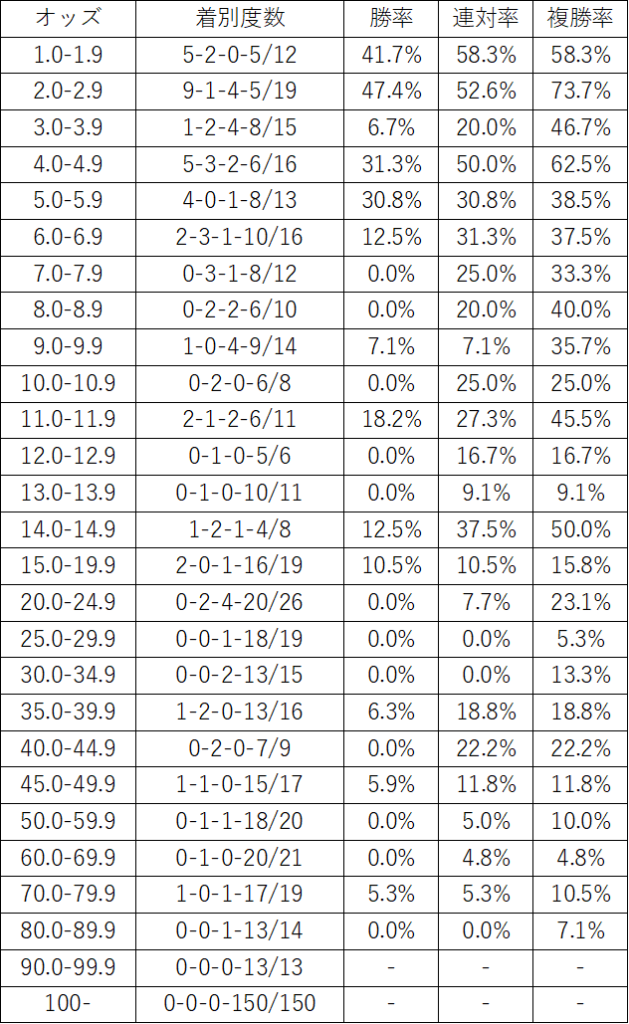 - オッズ1.0~1.9倍(複勝率58.3%)、2.0~2.9倍(複勝率73.7%)、3.0~3.9倍(複勝率46.7%)、4.0~4.9倍(複勝率62.5%)、6.0~6.9倍(複勝率37.5%)、11.0~11.9倍(複勝率45.5%)、14.0~14.9倍(複勝率50.0%)