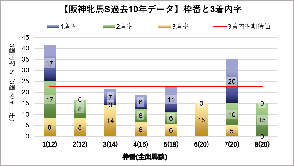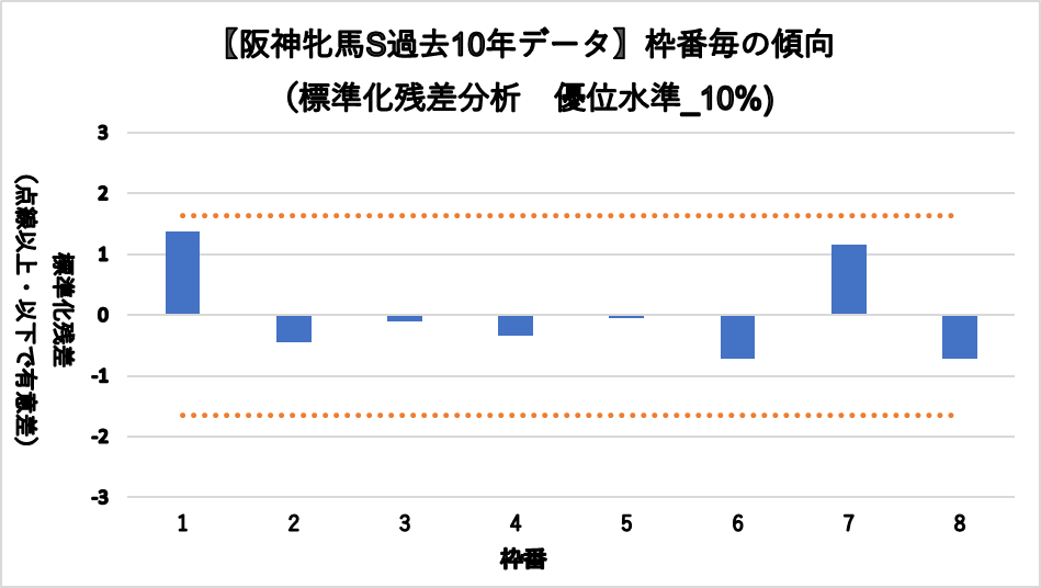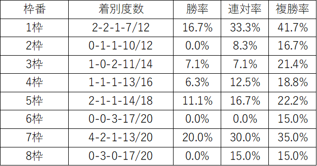 1, 7枠が好走する傾向が見られますが、統計的な有意差は認められなかった。
