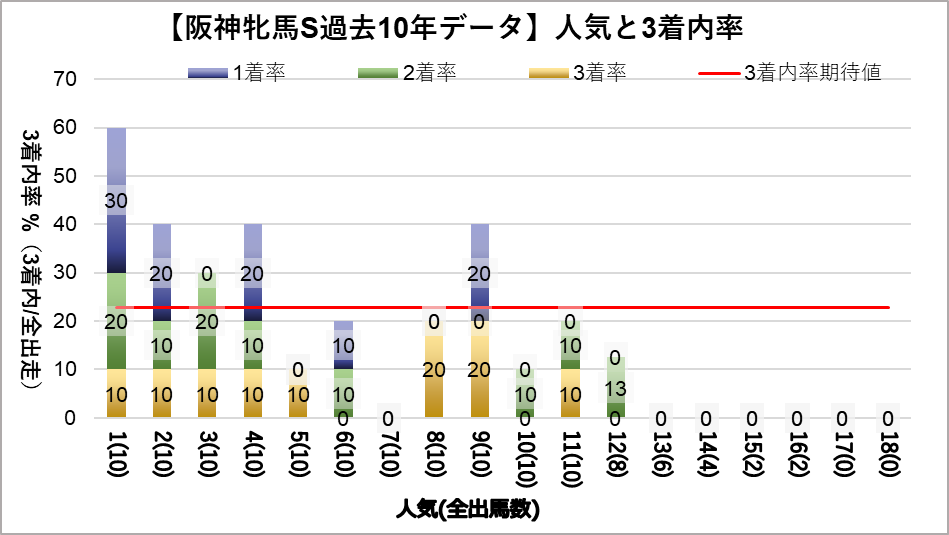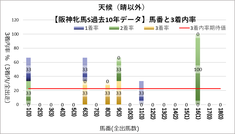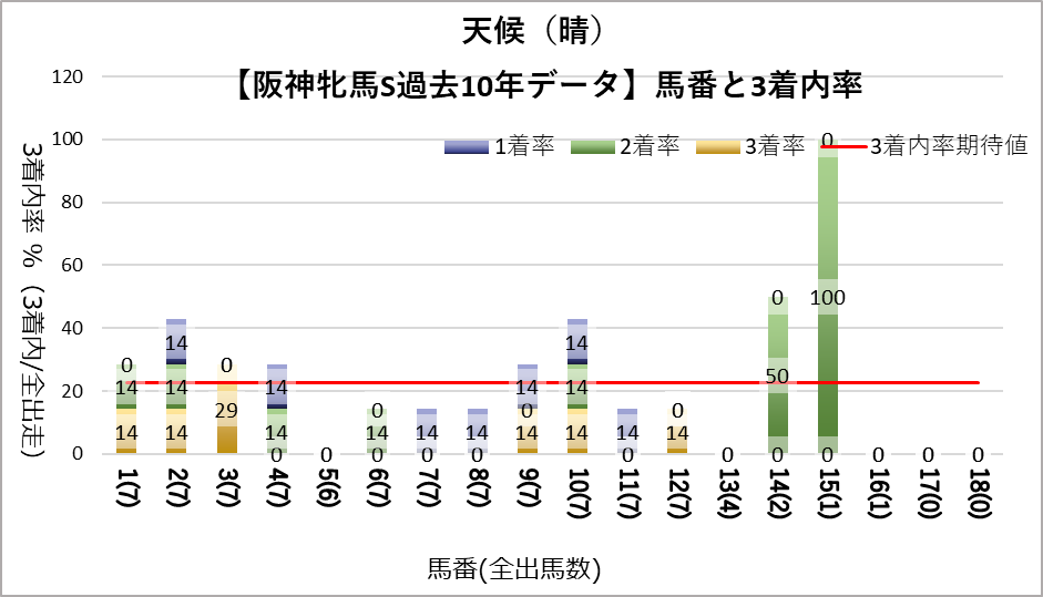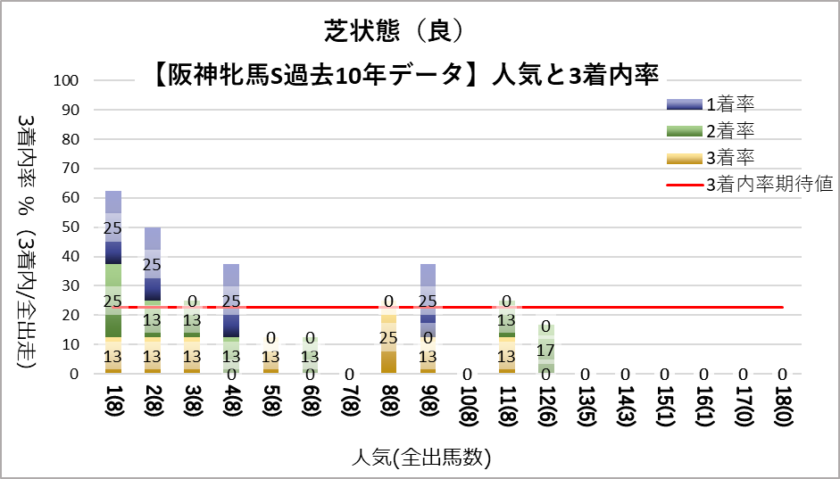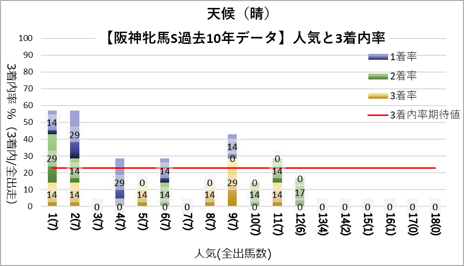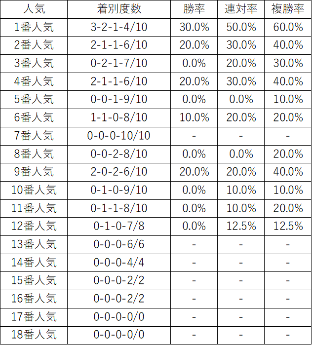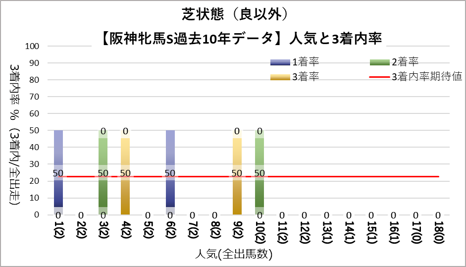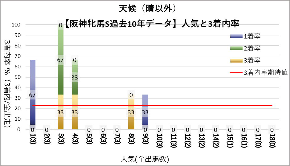 一方悪条件(晴以外・良以外)の場合、1人気と3人気の好走が見られる。良好条件では好走を見せていた2人気は一度も馬券に絡んでいない。