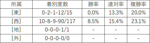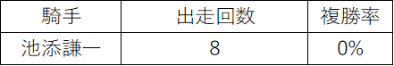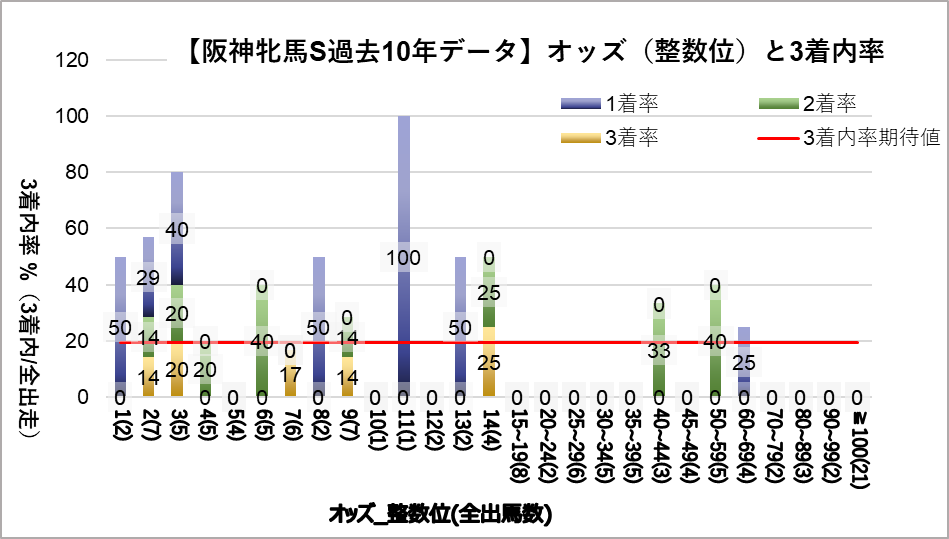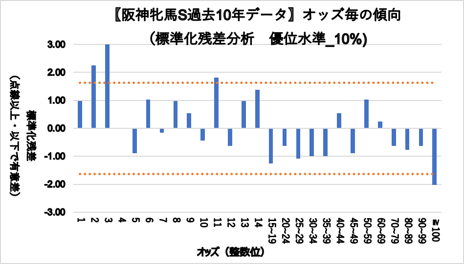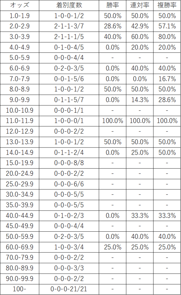 オッズ2.0~2.9倍(複勝率57.1%)、3.0~3.9倍(複勝率80.0%)、11.0~11.9倍(複勝率100%)※これらのオッズ帯に統計的有意差が認められ、平均複勝率(23%)よりも好走する傾向が見られた。