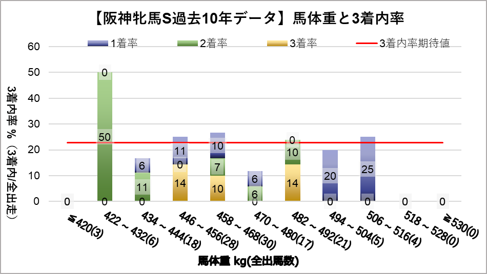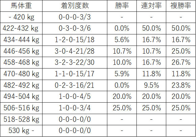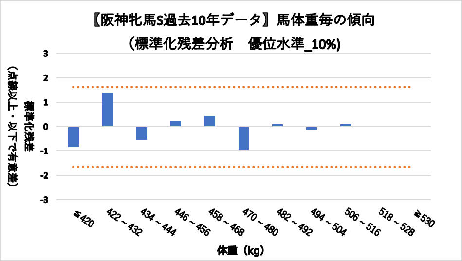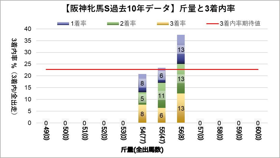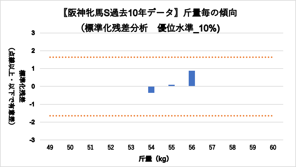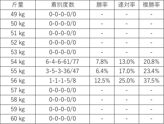 斤量56kgに好走する傾向がみられるが、統計的な有意差は認められなかった。