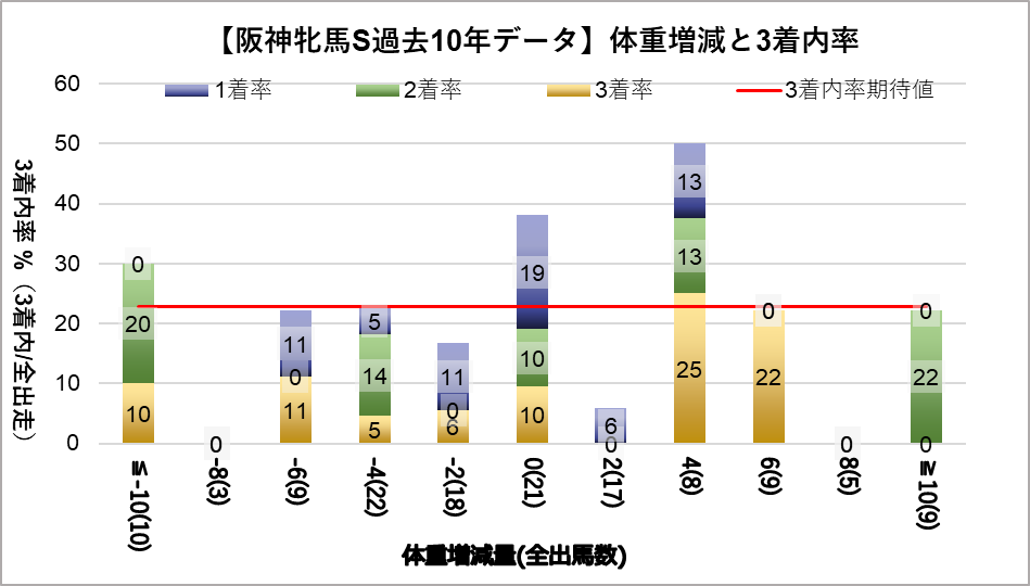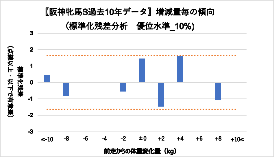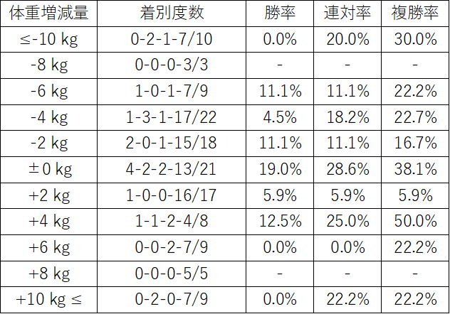 増減量+4kgに好走傾向が見られるが、統計的な有意差は認められなかった。