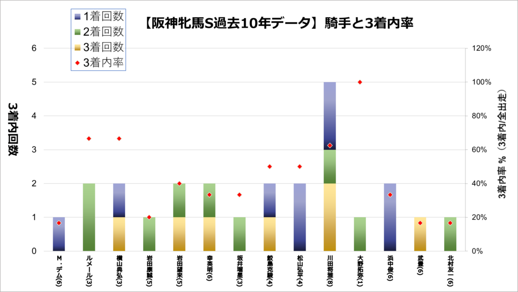 左軸:3着内回数(積み上げ棒グラフ参照)