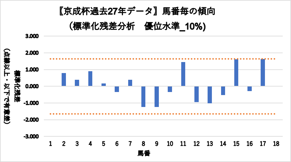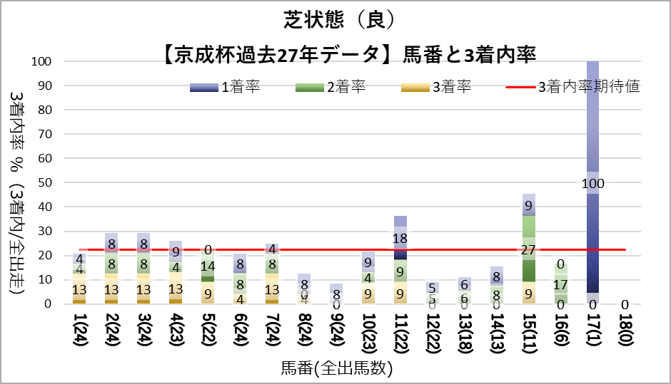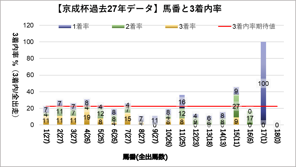 17番(複勝率100%)についてのみ統計的有意差が認められ、平均複勝率(22%)よりも好走する傾向が見られた。※出走数1回であるため注意