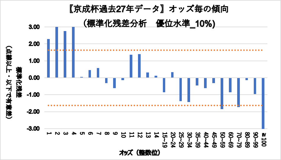 一方、50.0~59.9倍, 70.0~79.9倍, 100倍以上は統計的に見ても有意に凡走傾向である。