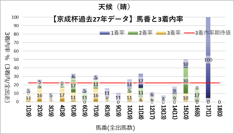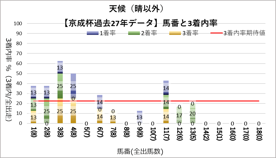 天候によって好走する馬番が異なり、晴の時は15番、晴以外の時は3番が好走する傾向が見られた。