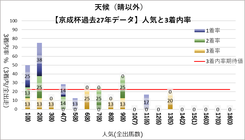 天候が晴の時に絞ると、人気が高いほど好成績である。一方、晴以外の時は2人気が突出した成績を残している。