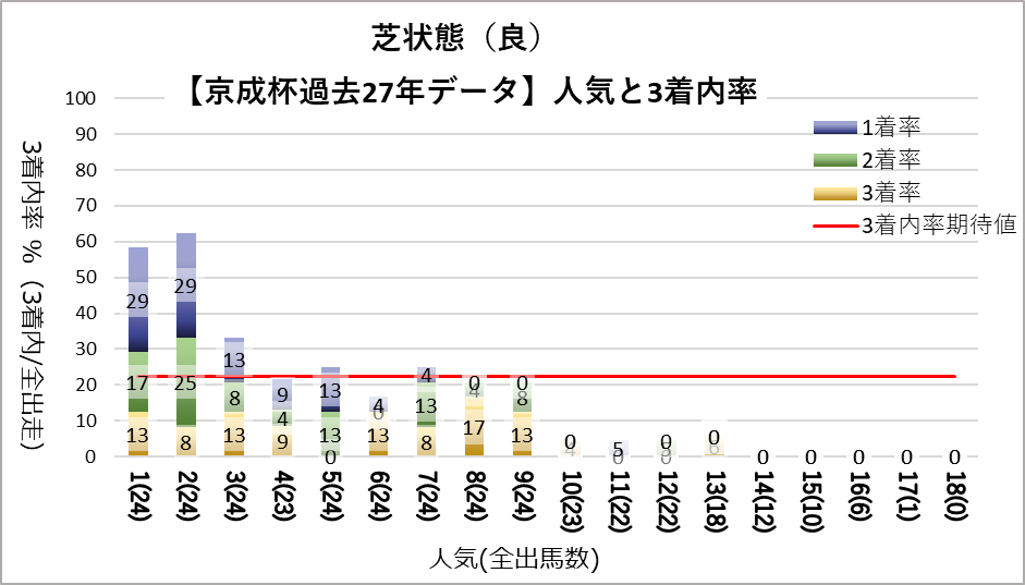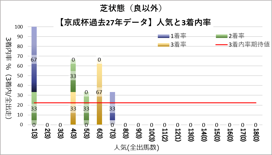 芝状態については良芝の場合1,2人気が同水準で好走しているのに対し、良芝以外の場合だと1人気が圧倒的好成績を残している。