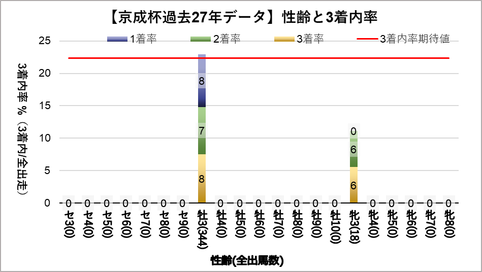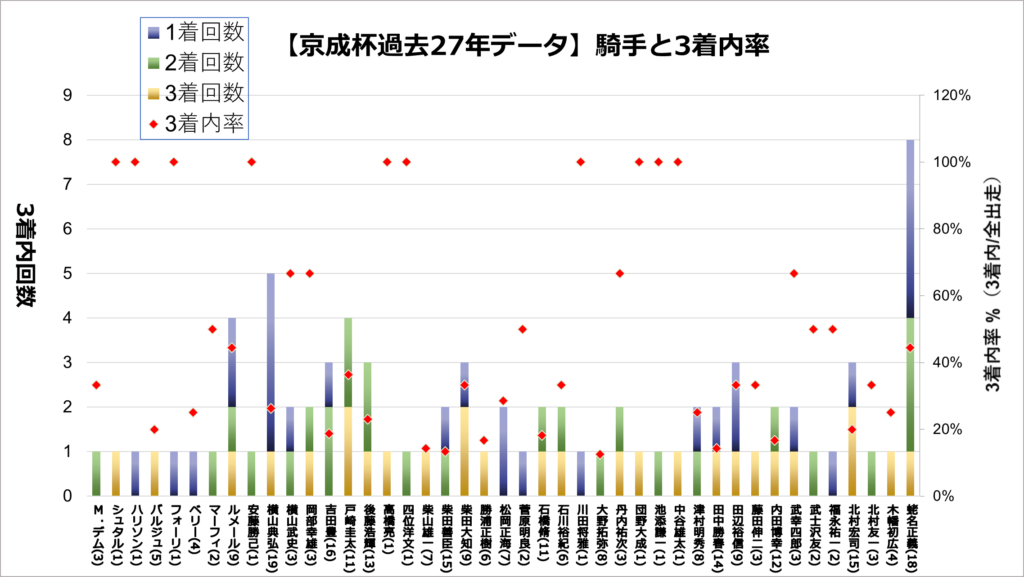 左軸:3着内回数(積み上げ棒グラフ参照)