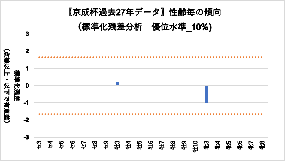 統計的に有意差があった項目について、3着内率グラフと統計処理(標準残差分析)グラフの2つを掲載しています。