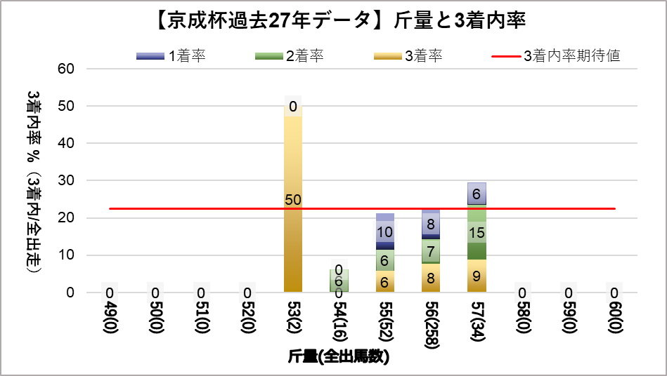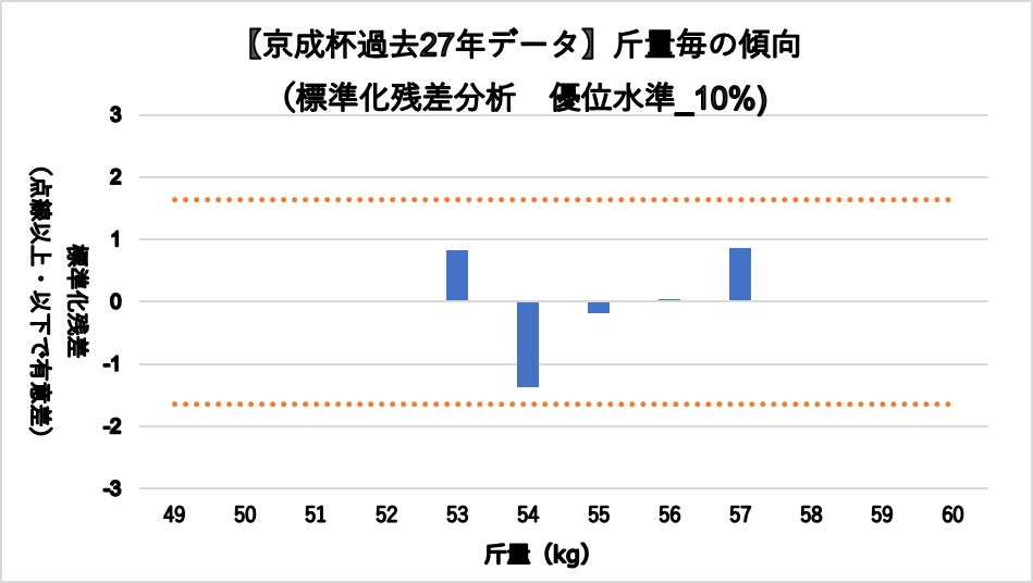 斤量54kgについて凡走傾向がみられるが、統計的な有意差は認められなかった。