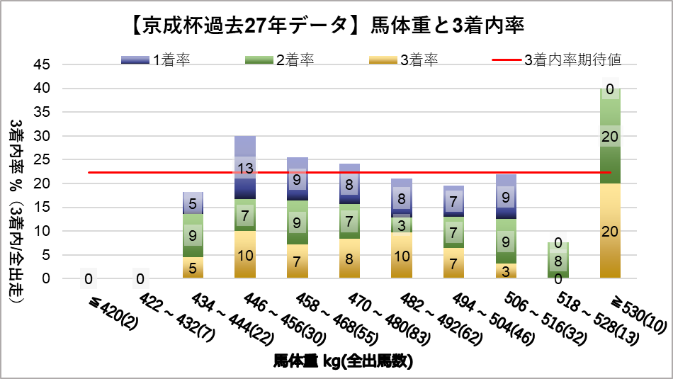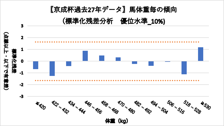 518~528kgレンジに凡走傾向がみられるが、統計的な有意差は認められなかった。