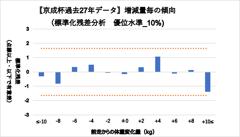 増減量+10kg以上において凡走傾向がみられるが、統計的な有意差は認められなかった。