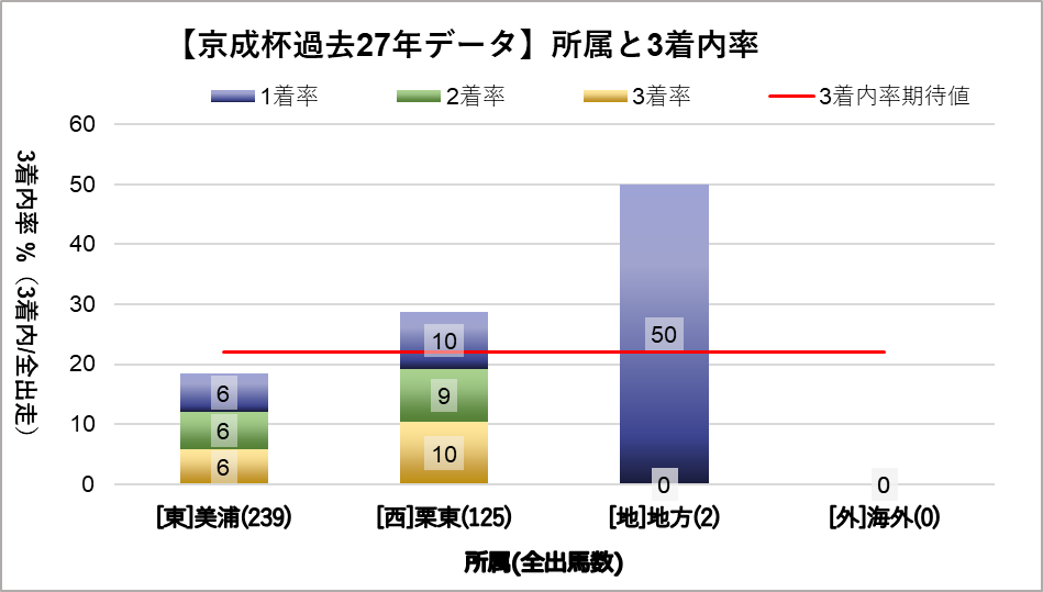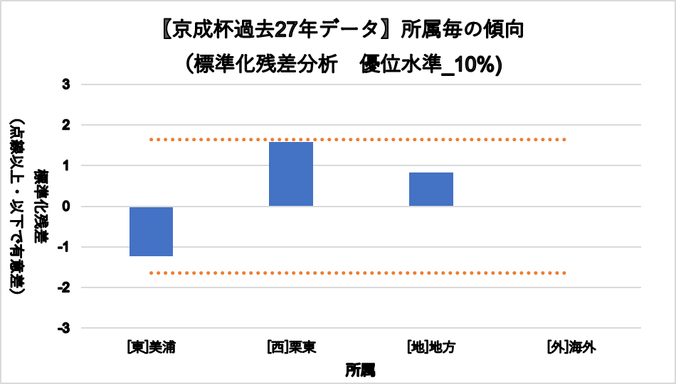 東(栗東)所属が好走する傾向がみられるが、統計的な有意差は認められなかった。