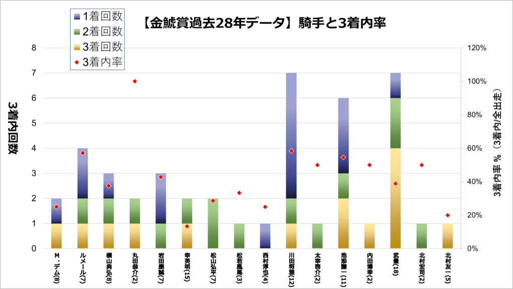 3着内回数一位は7回で川田将雅 騎手と武豊 騎手。