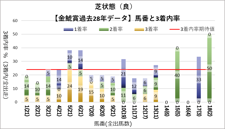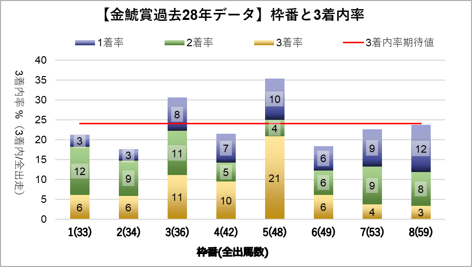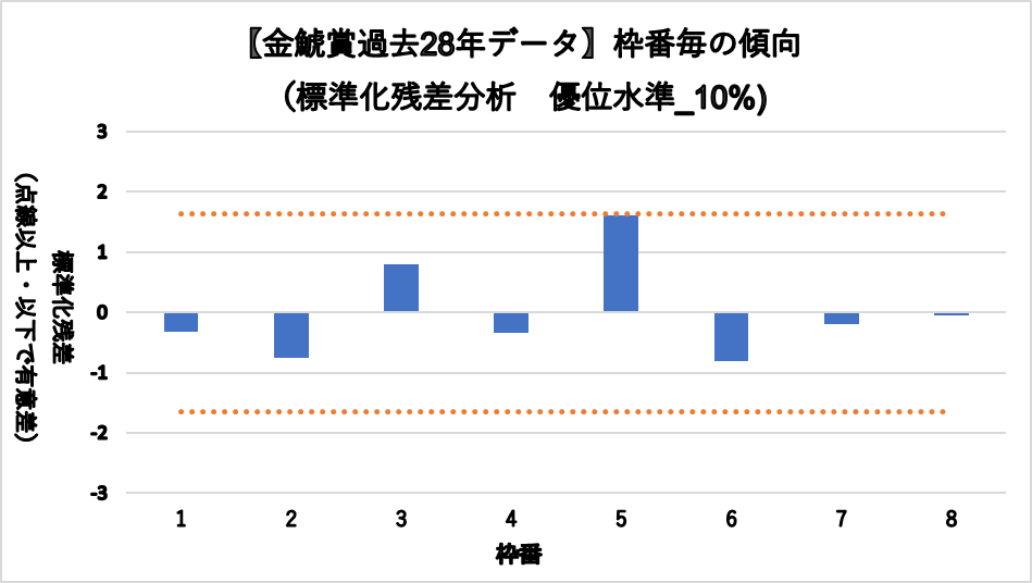 5枠が好走する傾向が見られるが、統計的な有意差は認められなかった。