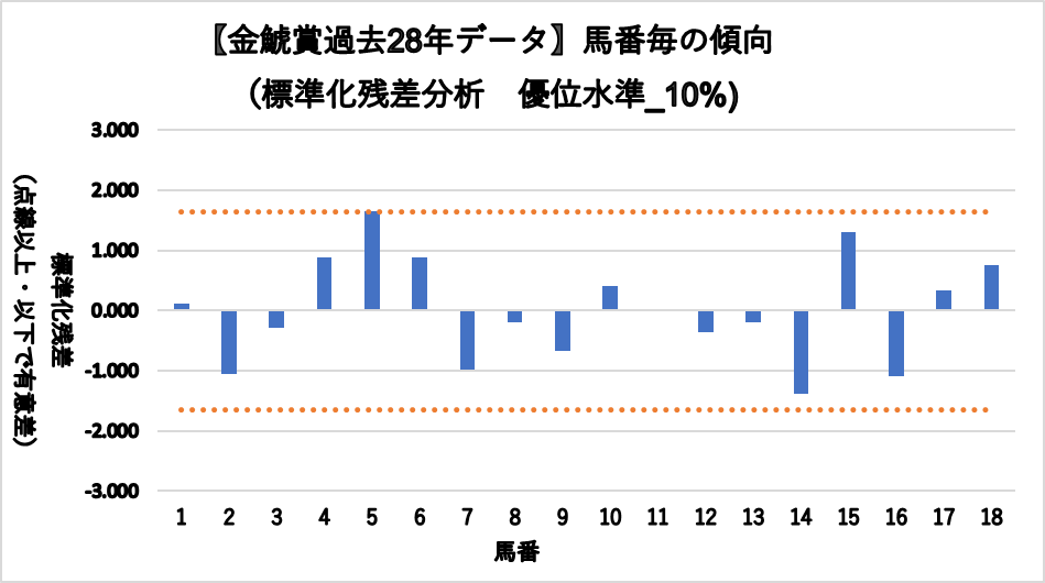 統計的に有意差があった項目について、3着内率グラフと統計処理(標準残差分析)グラフの2つを掲載しています。
