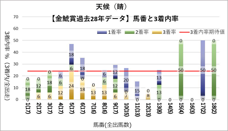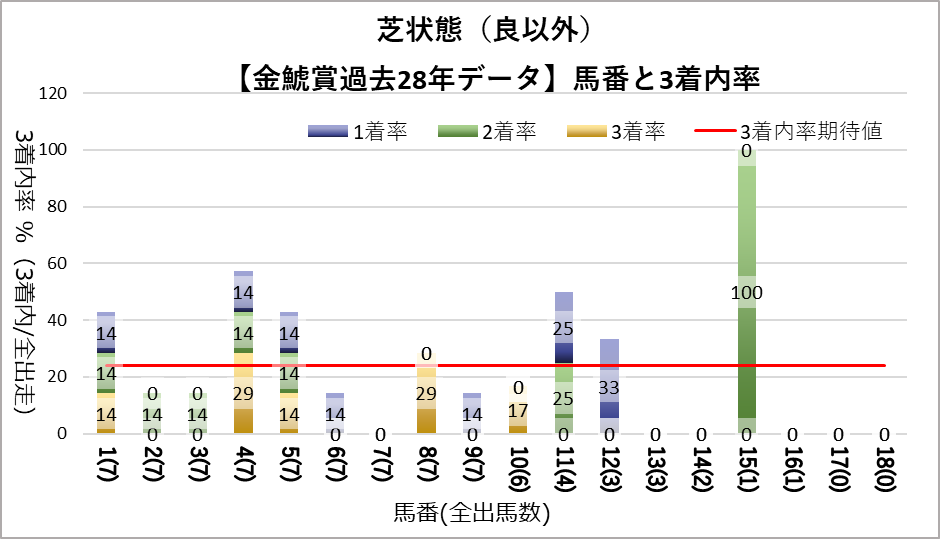 5番は全条件で平均以上の成績を残している。特に良好条件(晴・良芝)では抜きん出て好走している。