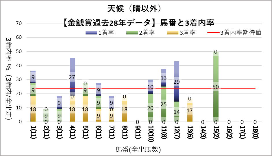 その他、悪条件(晴以外・良芝以外)では4番の好走が目立っている。