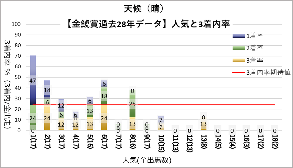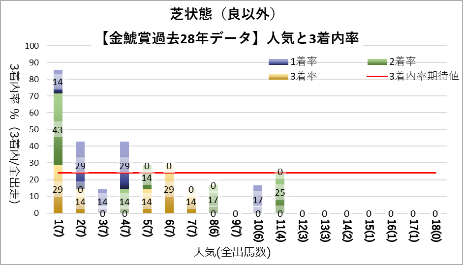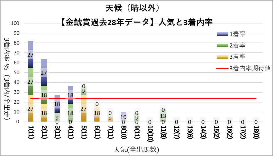 1人気はどの条件下でも複勝率が7割を超えており、圧倒的な成績を残している。特に悪条件(晴以外・良芝以外)では複勝率が8割を超えている。
