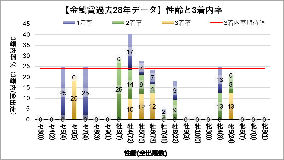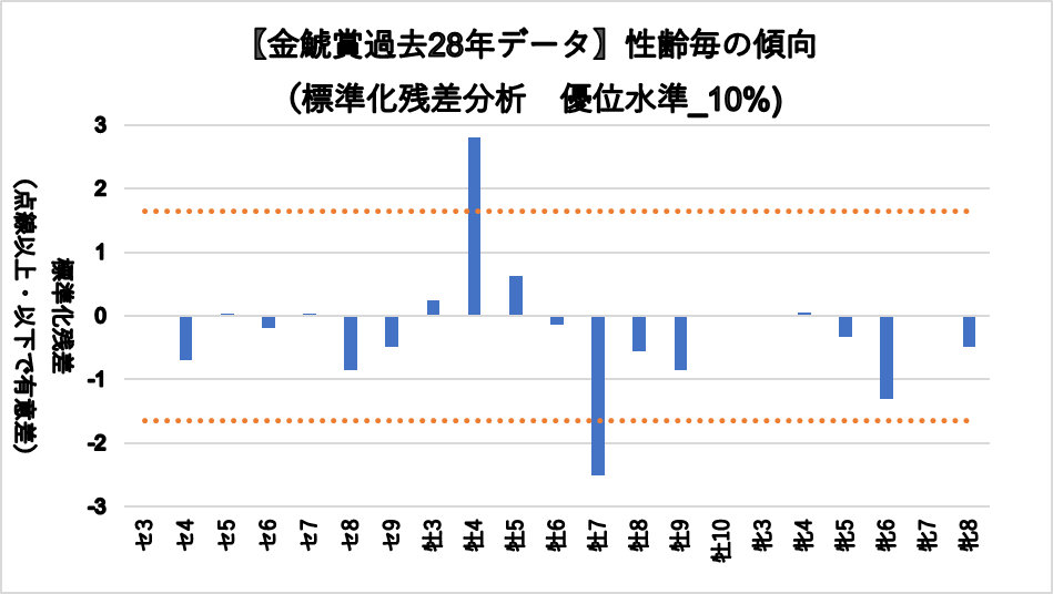 牡馬4歳(複勝率40.3%)に統計的有意差が認められ、平均複勝率(25%)よりも好走する傾向が見られた。