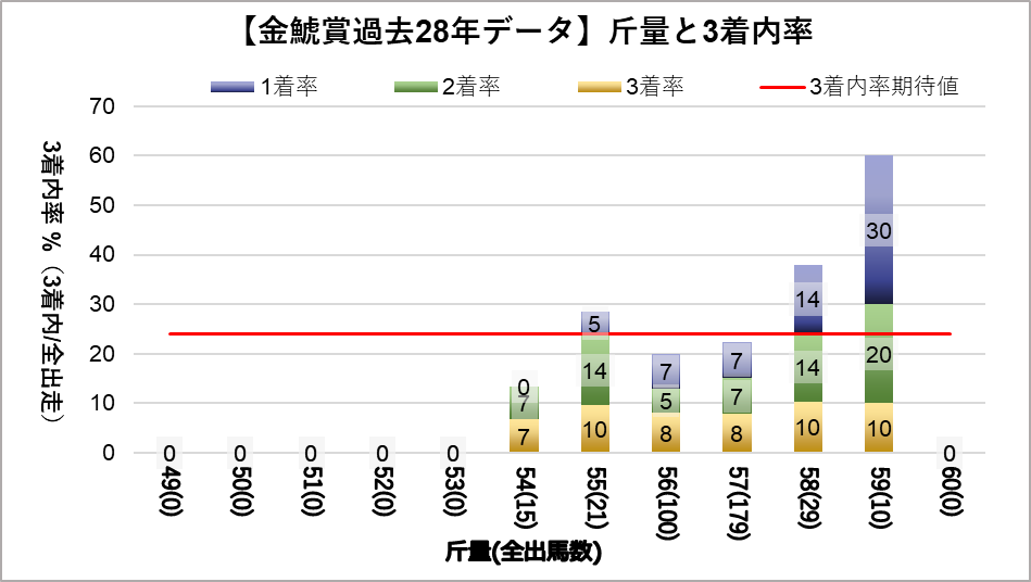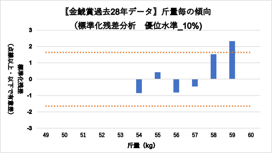 斤量59kg(複勝率60.0%)に統計的有意差が認められ、平均複勝率(25%)よりも好走する傾向が見られた。