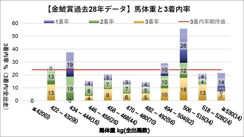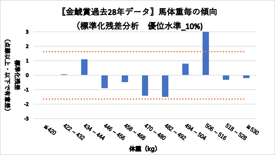 馬体重506~516kgレンジ(複勝率55.9%)において、統計的有意差が認められ、平均複勝率(25%)よりも好走する傾向が見られた