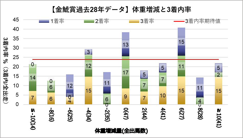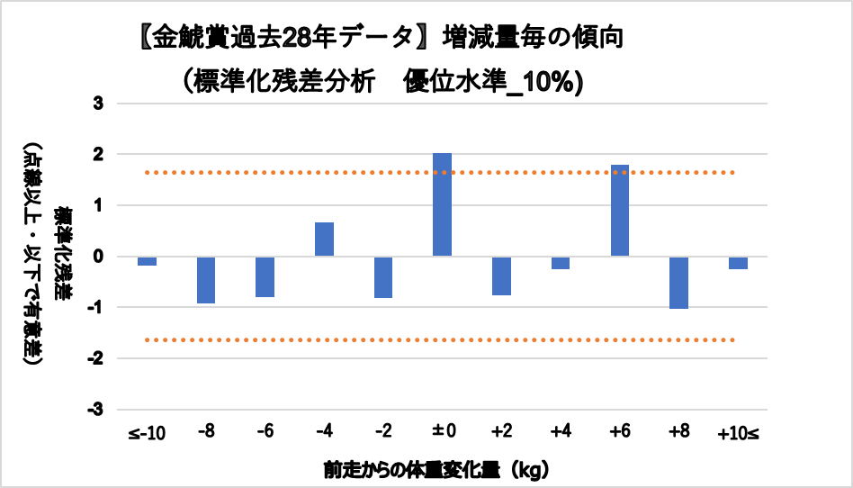 増減量±0kg(複勝率38.3%)と+6kg(複勝率40.7%)に統計的有意差が認められ、平均複勝率(25%)よりも好走する傾向が見られた。
