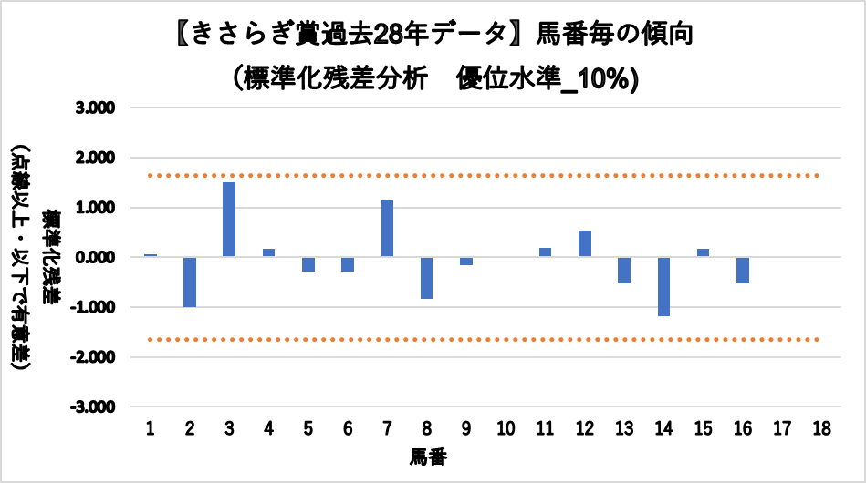 統計的に有意差があった項目について、3着内率グラフと統計処理(標準残差分析)グラフの2つを掲載しています。