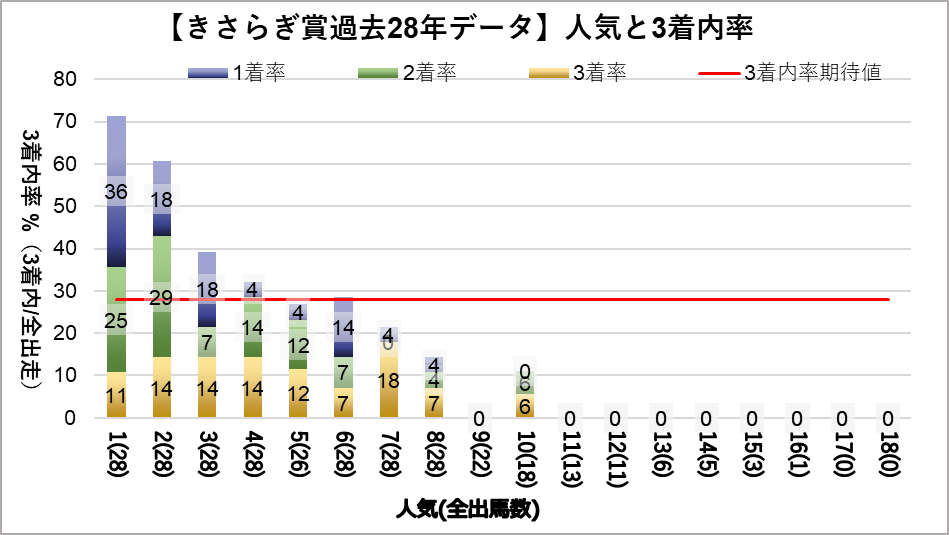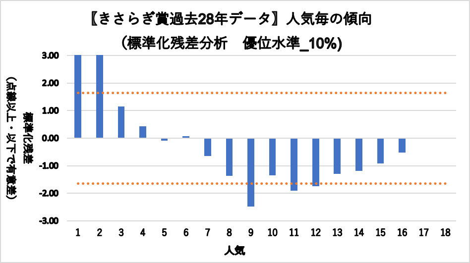 1人気(複勝率71.4%)、2人気(複勝率60.7%)これらの人気に統計的有意差が認められ、平均複勝率(28%)よりも好走する傾向が見られた。