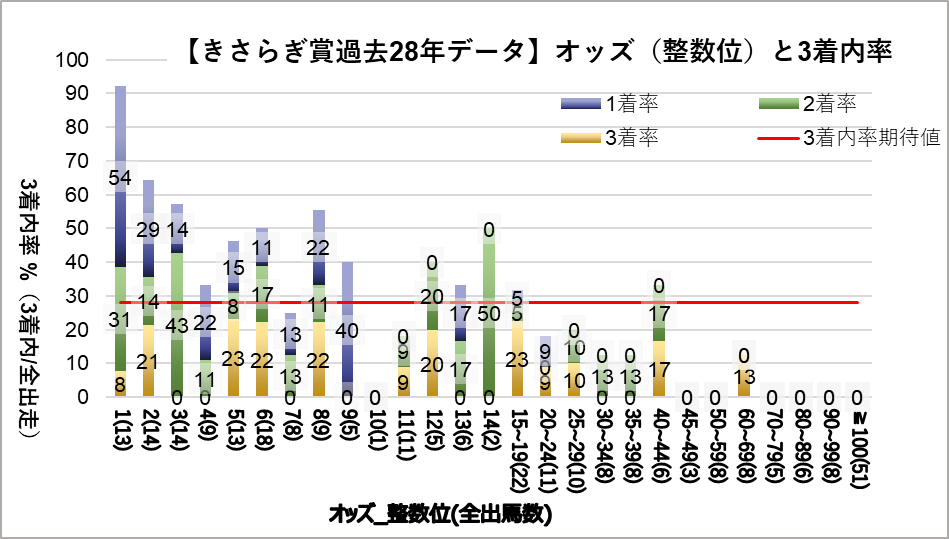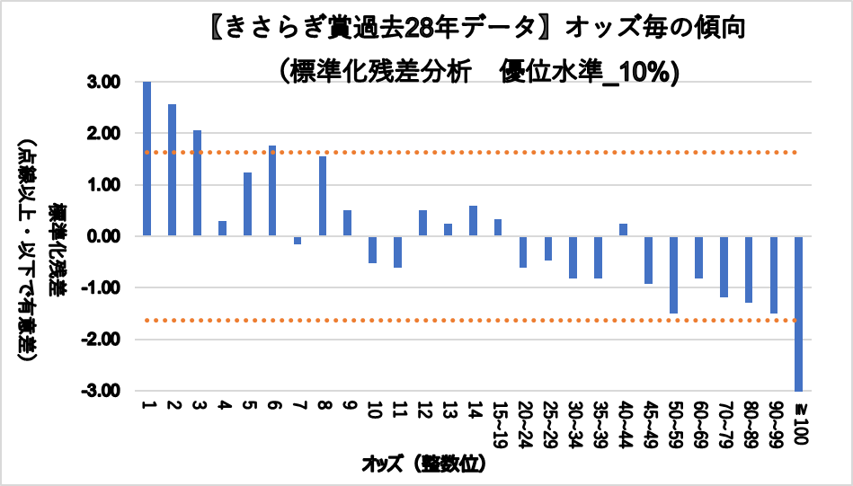 1.0~1.9倍(複勝率92.3%)、2.0~2.9倍(複勝率64.3%)、3.0~3.9倍(複勝率57.1%)、6.0~6.9倍(複勝率50.0%)、これらのオッズ帯に統計的有意差が認められ、平均複勝率(28%)よりも好走する傾向が見られた。