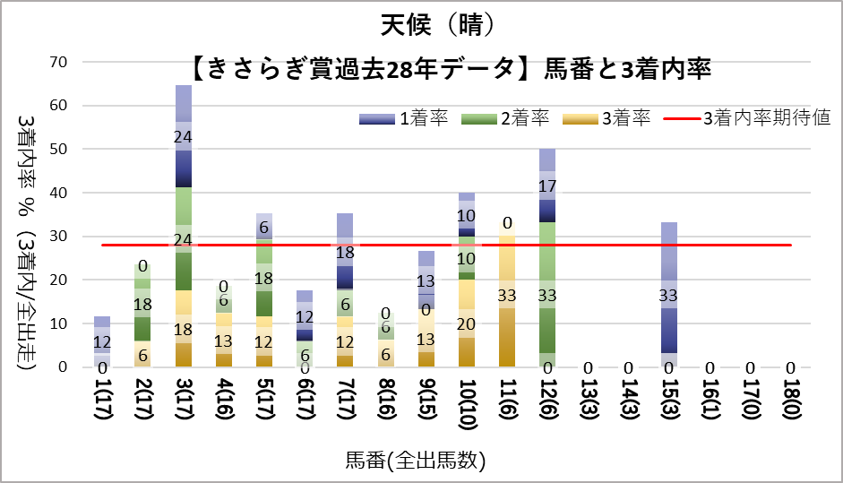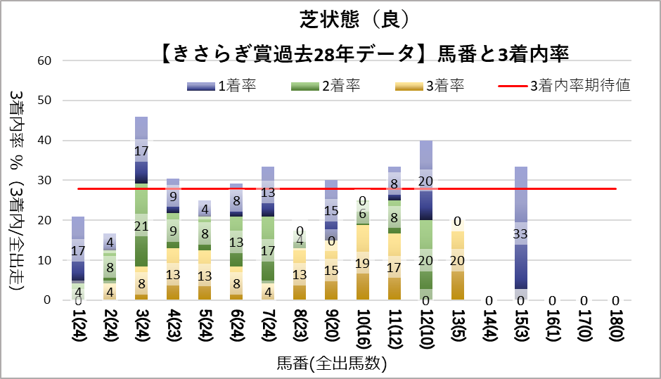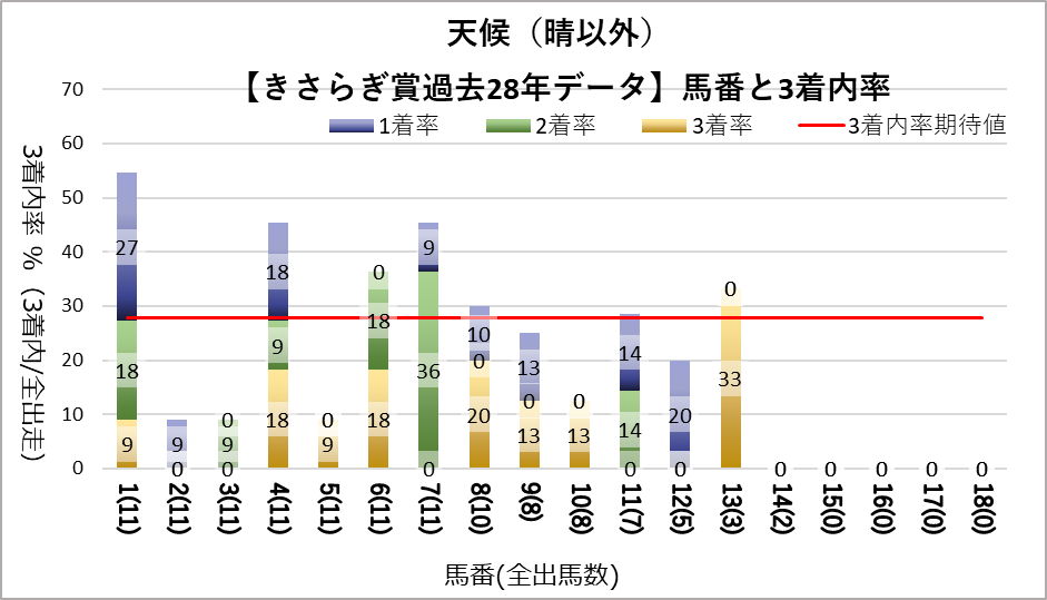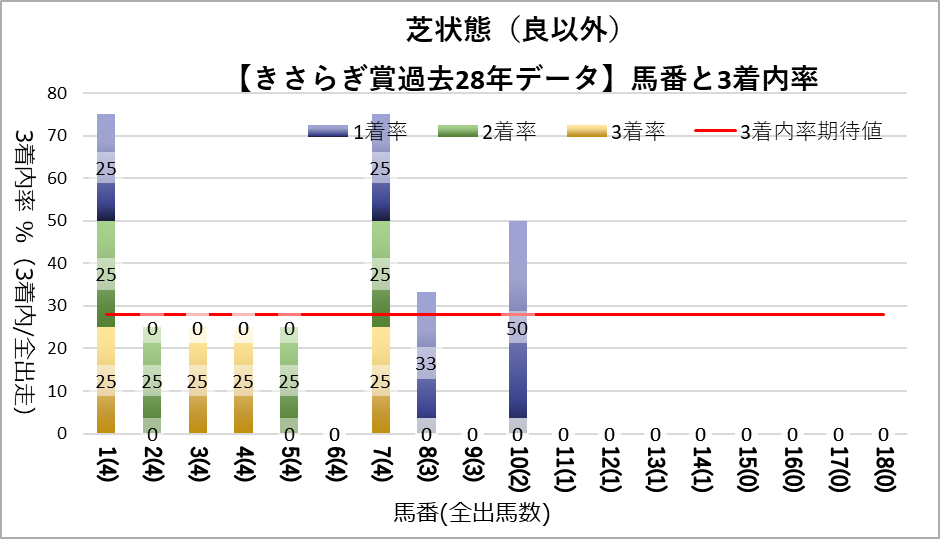 特に良好条件(晴・良芝)では3番の好走が目立つ。一方不良条件(晴以外・良芝以外)では1番の好走が目立つ。