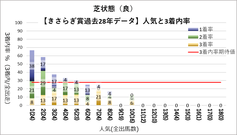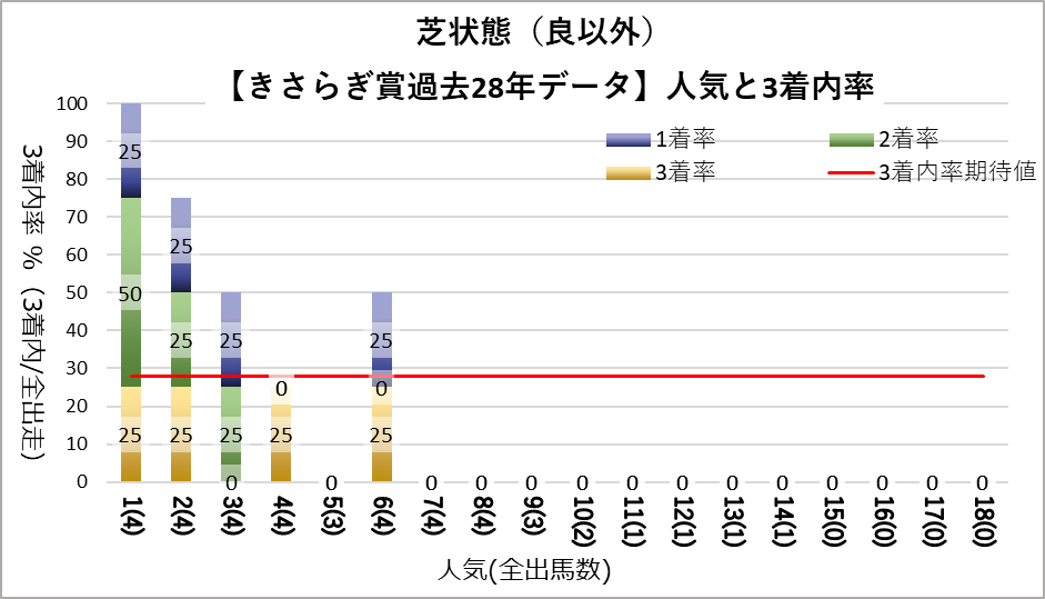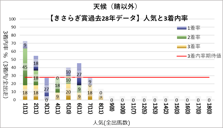 どのような条件下でも1, 2人気は好成績を残している。また、良好条件(晴・良芝)では人気に応じて好成績を残している一方、不良条件(晴以外・良芝以外)では6人気付近の好走が目立った。