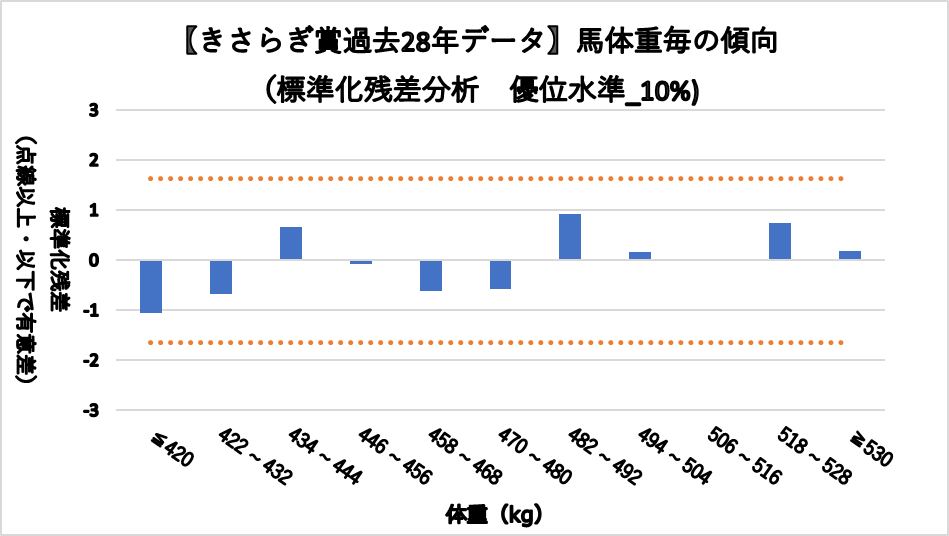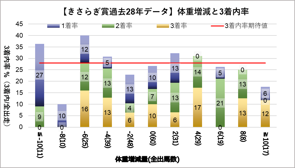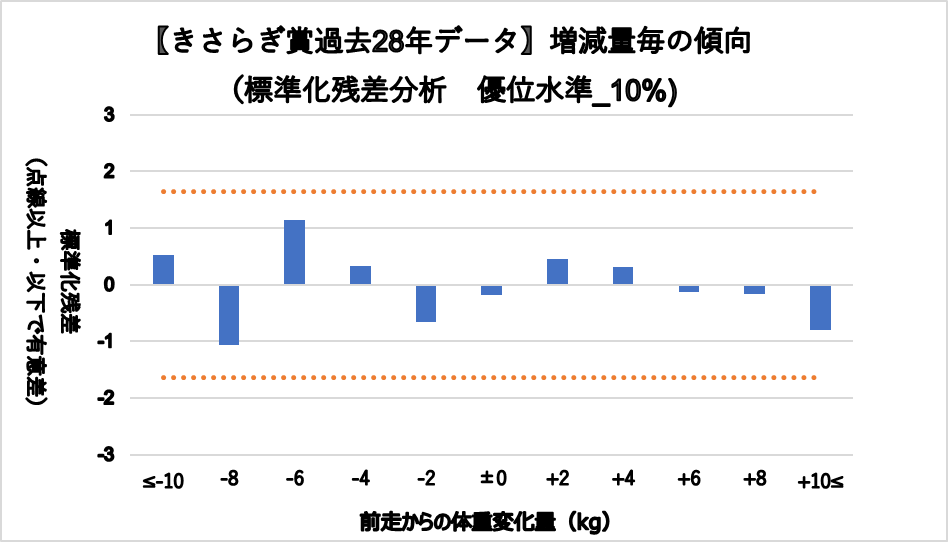 増減量-8kgが最も好走する傾向が見られたが、統計的な有意差は認められなかった。