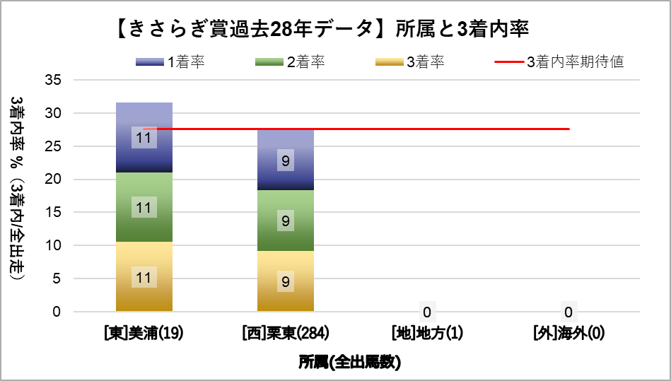 東(美浦)所属馬が好走する傾向が見られたが、統計的な有意差は認められなかった。