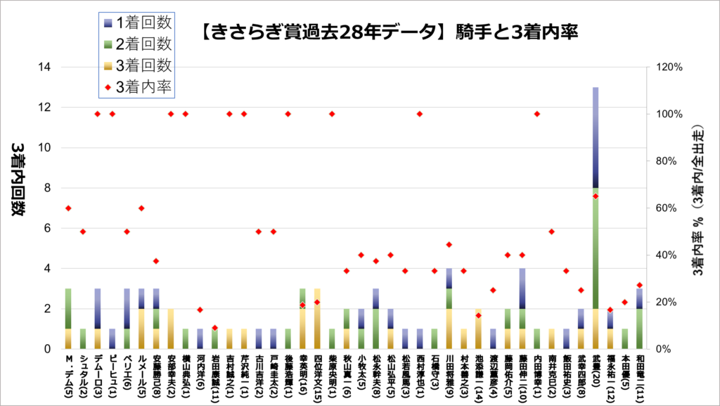 現役かつ複数騎乗した騎手のうち、三着内率が最も高かったのも武豊 騎手(複勝率65%)である。