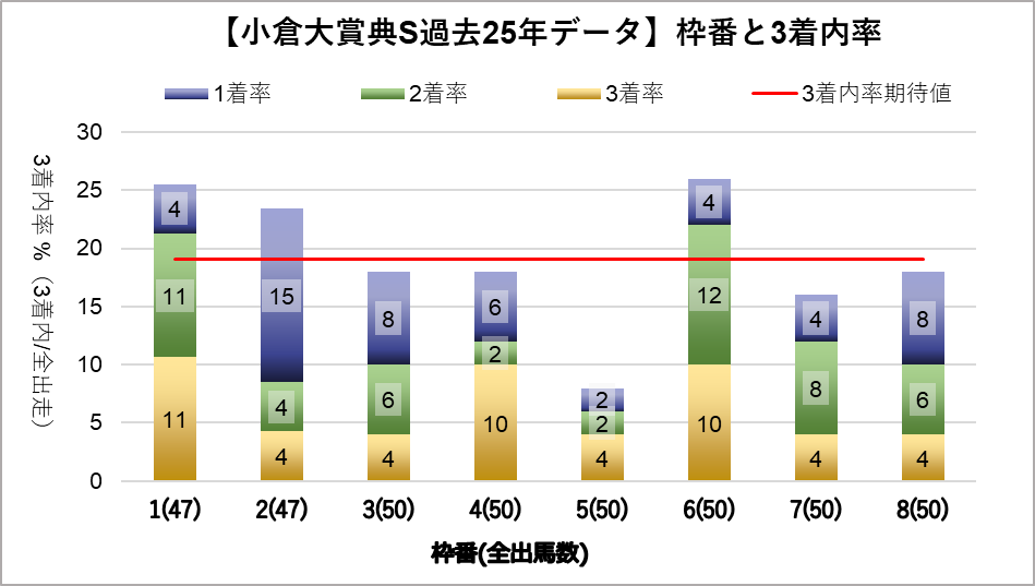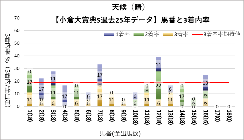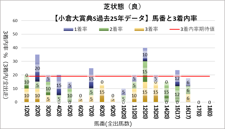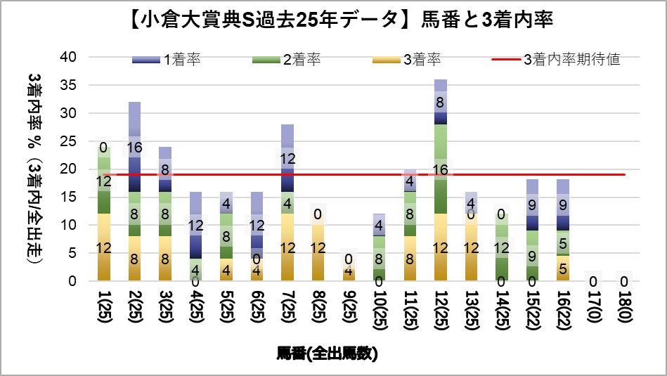 12番(複勝率36.0%)についてのみ統計的有意差が認められ、平均複勝率(19%)よりも好走する傾向が見られた。