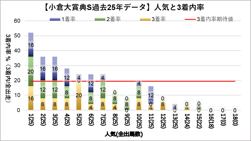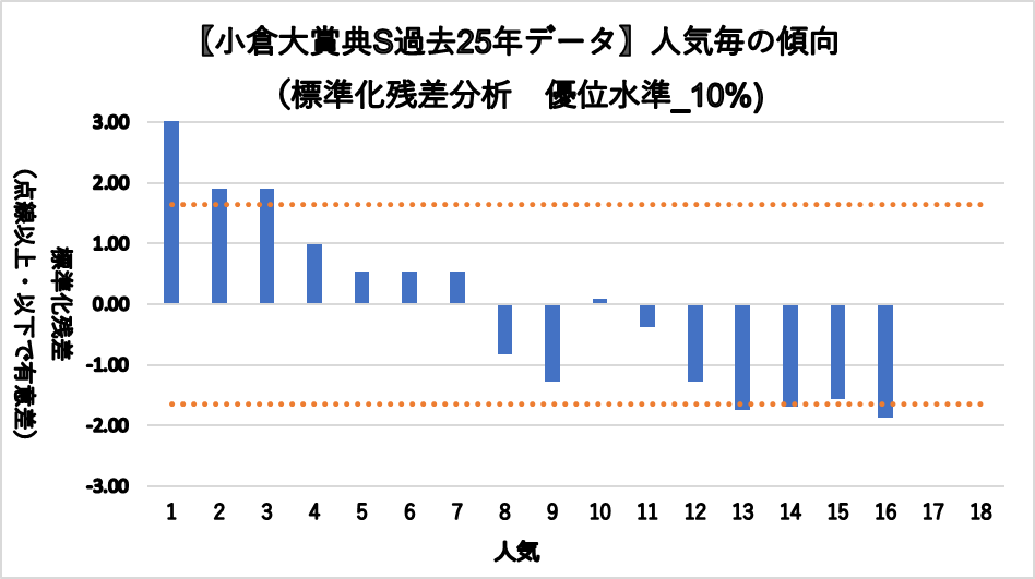 1人気(複勝率52.0%)、2人気(複勝率36.0%)、3人気(複勝率36.0%)これらの人気に統計的有意差が認められ、平均複勝率(19%)よりも好走する傾向が見られた。